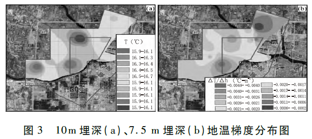 考慮淺部地溫受多因素影響,為有效識別淺層地溫異常區域,本次求取了7.5m埋深處地溫梯度公式(1),并繪制了7.5m埋深地溫梯度暈圖。由圖3(b)可見可見,7.5m埋深