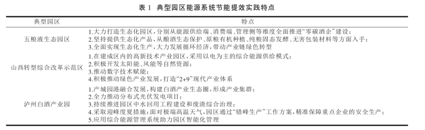 園區(qū)在推動(dòng)我國(guó)實(shí)體經(jīng)濟(jì)發(fā)展和城鎮(zhèn)化發(fā)展中發(fā)揮了關(guān)鍵作用,是支撐制造強(qiáng)國(guó)戰(zhàn)略的主戰(zhàn)場(chǎng)。有研究表明,園區(qū)二氧化碳排放量約占全國(guó)總排放量的31%[4],園區(qū)是資源能源消耗最集中的地方。現(xiàn)階段,為了節(jié)約能源,保護(hù)環(huán)境,我國(guó)各級(jí)園區(qū)都在持續(xù)推動(dòng)綠色低碳發(fā)展。田金平等研究指出我國(guó)工業(yè)園區(qū)節(jié)能提效實(shí)踐創(chuàng)新主要體現(xiàn)在以下5個(gè)方面: ①聚焦重點(diǎn)領(lǐng)域,全過程系統(tǒng)性推進(jìn)節(jié)能工作。②集中式能源基礎(chǔ)設(shè)施升級(jí)改造,多樣化開發(fā)利用余熱、 余壓和能量多級(jí)利用。③積極利用可再生能源,推進(jìn)能源結(jié)構(gòu)轉(zhuǎn)型升級(jí)。④積極開展智慧能源探索,實(shí)現(xiàn)能源全過程精細(xì)化管理。⑤建立健全能源管理體系。表1為典型園區(qū)能源系統(tǒng)節(jié)能提效實(shí)踐特點(diǎn)。