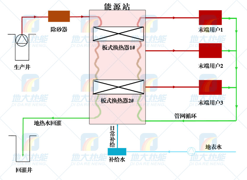 地熱井供暖的工藝流程相對而言比較簡單,對水溫的要求寬松,水溫從15℃-180℃都可以用于供暖,水溫較高的更可以直接省卻加熱的步驟直接使用,地大熱能減少了供暖過程中的熱能損失。