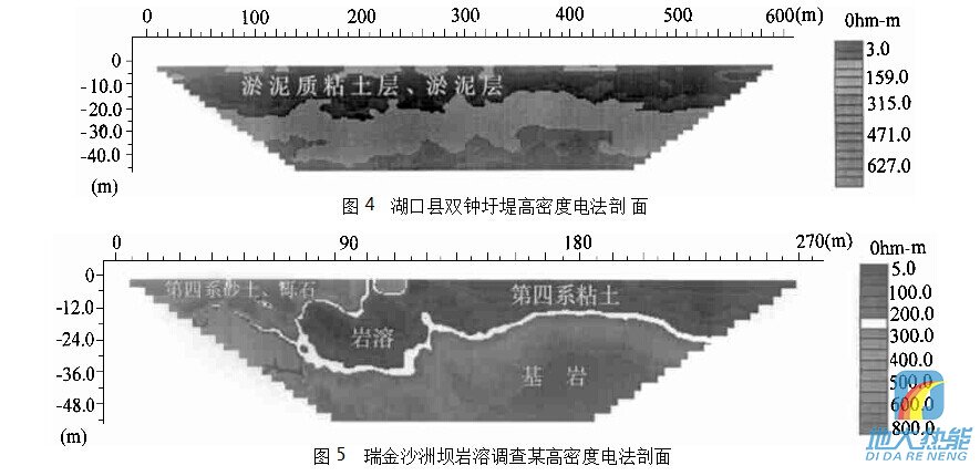 在雙鐘圩堤的高密度電法勘察中,選用120根電極,點 距5m。圖4是該堤段高密度電測剖面,淤泥質粘土層與淤泥層為明顯低電性層,其電阻率值在20~608#m。剖面布置于堤段內側,填壩厚度約5m,圖4中顯示整個剖面分布低電性層,其厚度在8~16m。 綜合該區其他物探方法及地質資料分析:大堤下部廣泛分布的較厚的淤泥質粘土層與淤泥層作為壩基礎,無法支承上覆壩體的壓力,施工中的機械振動、船舶來往時的水擾動等誘發因素導致壩體滑塌入湖中。
