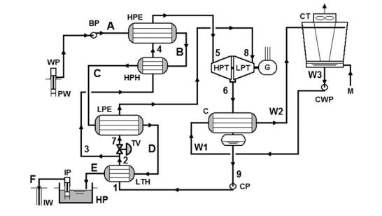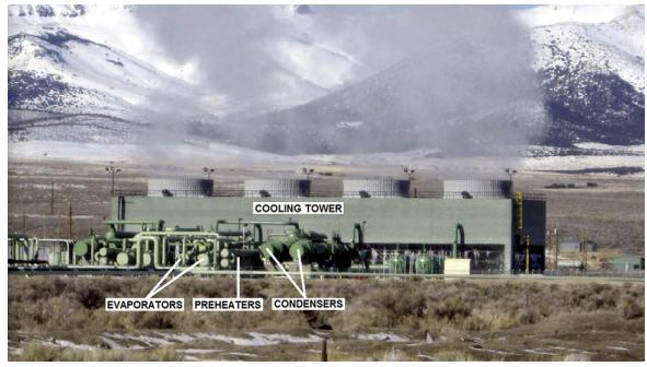 最新的USGeo拉夫特河發(fā)電站坐落在起初的電站南南東方向約600m的地方。這個(gè)最新的發(fā)電機(jī)組的能量對流系統(tǒng)是一個(gè)部分回?zé)幔墸p壓力雙循環(huán)發(fā)電機(jī)組。有兩個(gè)單獨(dú)的單元,每一個(gè)單元都有兩個(gè)軸向流動的渦輪來驅(qū)動同一個(gè)中心發(fā)電機(jī)。一個(gè)四室的水冷卻塔為殼管冷凝器(shell-and-tube condensers)提供冷卻提供冷卻水。補(bǔ)充水是從水井中獲取的,而且需要及時(shí)處理來維持冷卻塔中的水的質(zhì)量。138℃的鹵水以大約3.15×106kg/s的速度泵向蒸發(fā)器和預(yù)熱器,循環(huán)工質(zhì)異戊烷(i-C5H12)就是在蒸發(fā)器和預(yù)熱器中吸收溫度的。換熱器只在高壓循環(huán)中才使用。