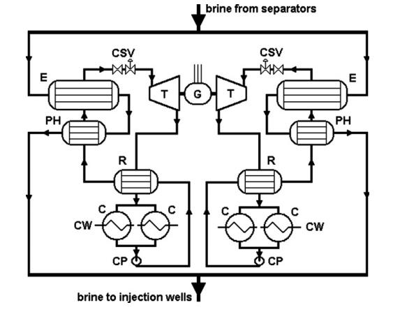 米拉瓦列斯的五號(hào)發(fā)電機(jī)組是2004年剛投入使用的。這個(gè)發(fā)電機(jī)利用從一號(hào)和二號(hào)和三號(hào)發(fā)電機(jī)組中的廢棄鹵水,通過注入井來獲取了可能回到熱儲(chǔ)層中的能量。總共的發(fā)電量是15.5MW,發(fā)電機(jī)組中的每一個(gè)發(fā)電單元都發(fā)出7.75MW的電。每一個(gè)發(fā)電單元是有兩個(gè)渦輪組成的,驅(qū)動(dòng)同一個(gè)發(fā)電機(jī)。循環(huán)工質(zhì)是常規(guī)的正戊烷,C5H12。每一個(gè)單元用兩個(gè)預(yù)熱器。兩個(gè)蒸發(fā)器跟他們各自的分隔板。兩個(gè)回?zé)崞鳎膫€(gè)水冷凝器。這個(gè)發(fā)電機(jī)組是有澳瑪特(Ormat)提供的。