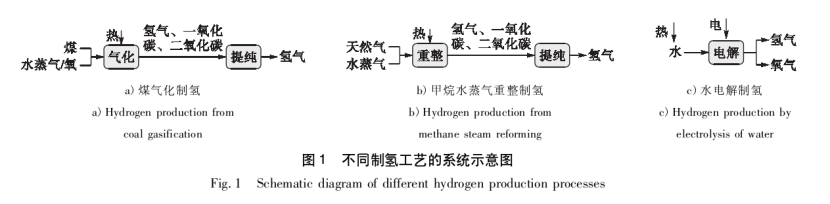 水電解工藝中ALK和PEM制氫工藝對溫度要求較低,技術(shù)成熟,但SOEC制氫工藝的工作溫度較高(約 900℃),目前處于產(chǎn)品試驗階段。電能可由太陽能、風能、水力能和地熱能等可再生能源獲取。水電解制氫只產(chǎn)生氫氣和氧氣,沒有二氧化碳排放,通常稱為綠氫,見圖1-c)。光解制氫工藝是利用太陽能的光熱來制取氫氣的前瞻性技術(shù)路線,包括太陽光催化分解水制氫、太陽光電化學分解制氫以及太陽能熱化學循環(huán)制氫,目前仍處于研究階段。
