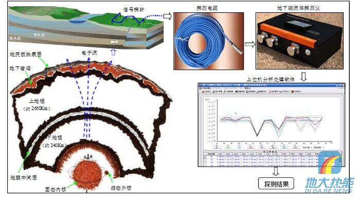 1、探測(cè)原理 UMF-Y05型探測(cè)系統(tǒng)是在地表通過探針接收來至地球內(nèi)部的地下磁流體電磁波,經(jīng)探測(cè)電纜到地下磁流體探測(cè)儀,由探測(cè)儀提取特征信息并送上位機(jī)綜合分析得出探測(cè)結(jié)果。