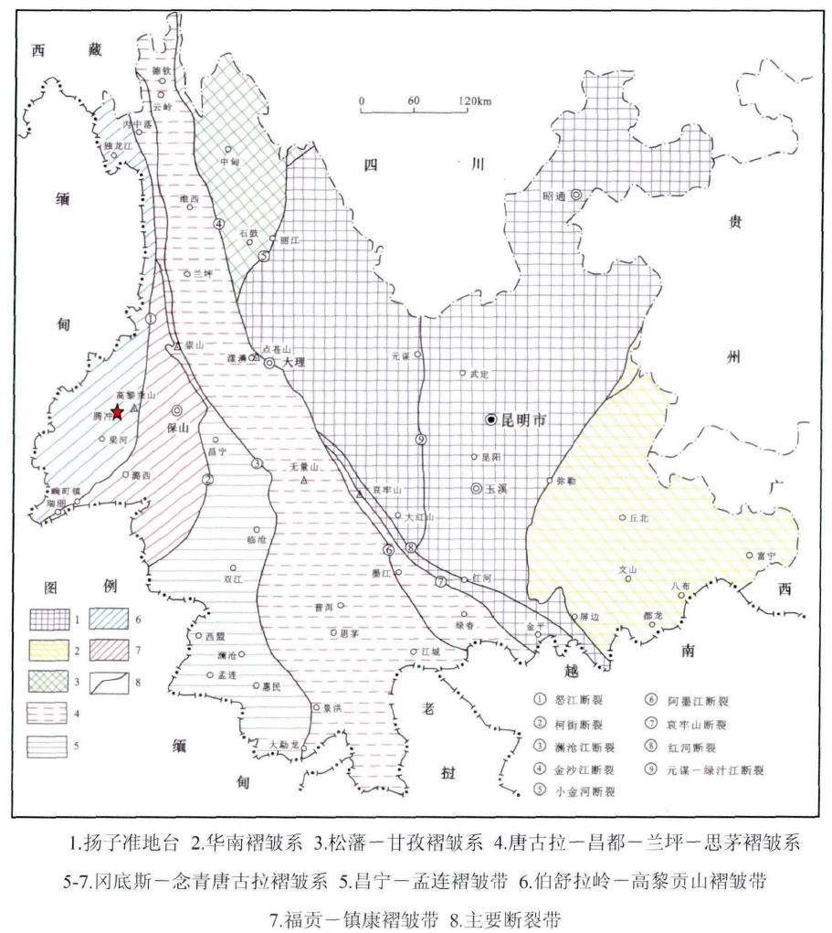 騰沖縣位于高黎貢山西側,總體地勢北高南低,山脈走向為北東一西向及南北向,與區域構造線基本一致。高黎貢山與怒江并列向南蜿誕,高黎貢山峰脊一線海拔多在3000m以上;而怒江河谷海拔僅500—900m,區內最高峰為高黎貢山中段的大腦子,海拔3780.9m;最低點為盈江縣拉沙河與穆雷江交匯處,海拔僅210m;最大高差達3570.9m,一般高差在400—2000m之間,屬中高山中一深切割地區。縣城西側為高中山地貌景觀,谷深坡陸;東側為中山山地稍為平緩,但切割密度較大;中部為斷陷谷地,河流階地發育,地勢平坦開闊。騰沖地區構造運動活躍、斷裂構造發育、巖漿活動頻繁、火成巖分布廣泛、新生代火山活動、現代水熱活動異常強烈,溫沸泉眾多。